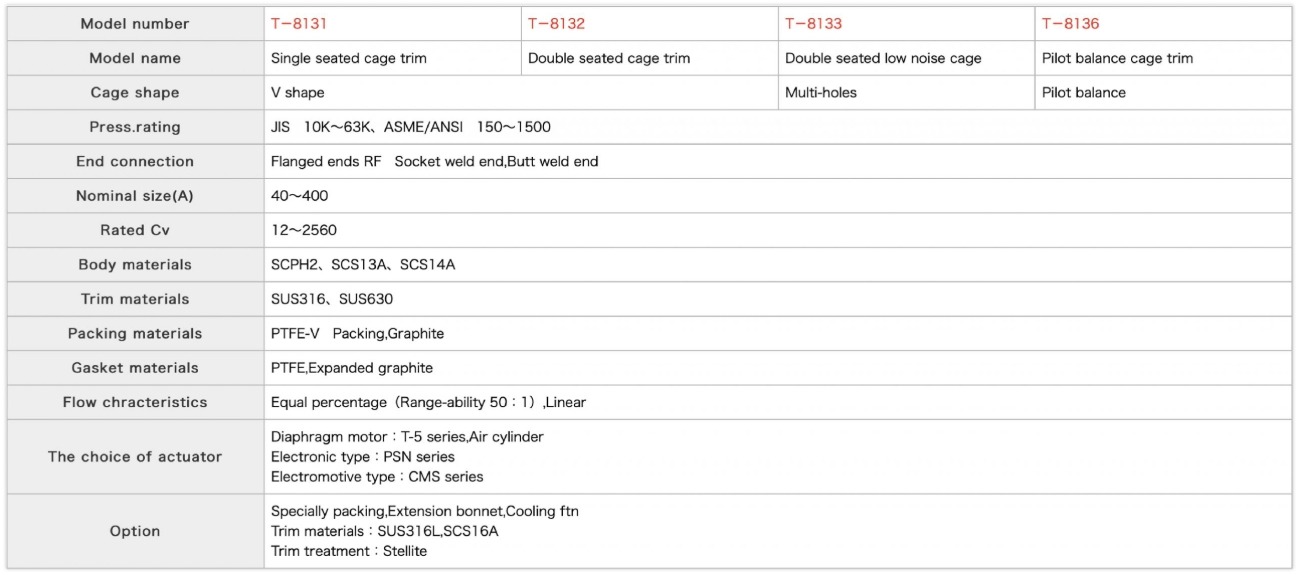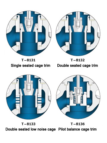 Cage type contorl valves is a pressure balance control valve which is applicable to controlling high pressure or high differential pressure fluid by balancing the pressure in the cage. Trims can be combined according to uses. Applicable to a wide range of temperature from -196℃ to 500℃.