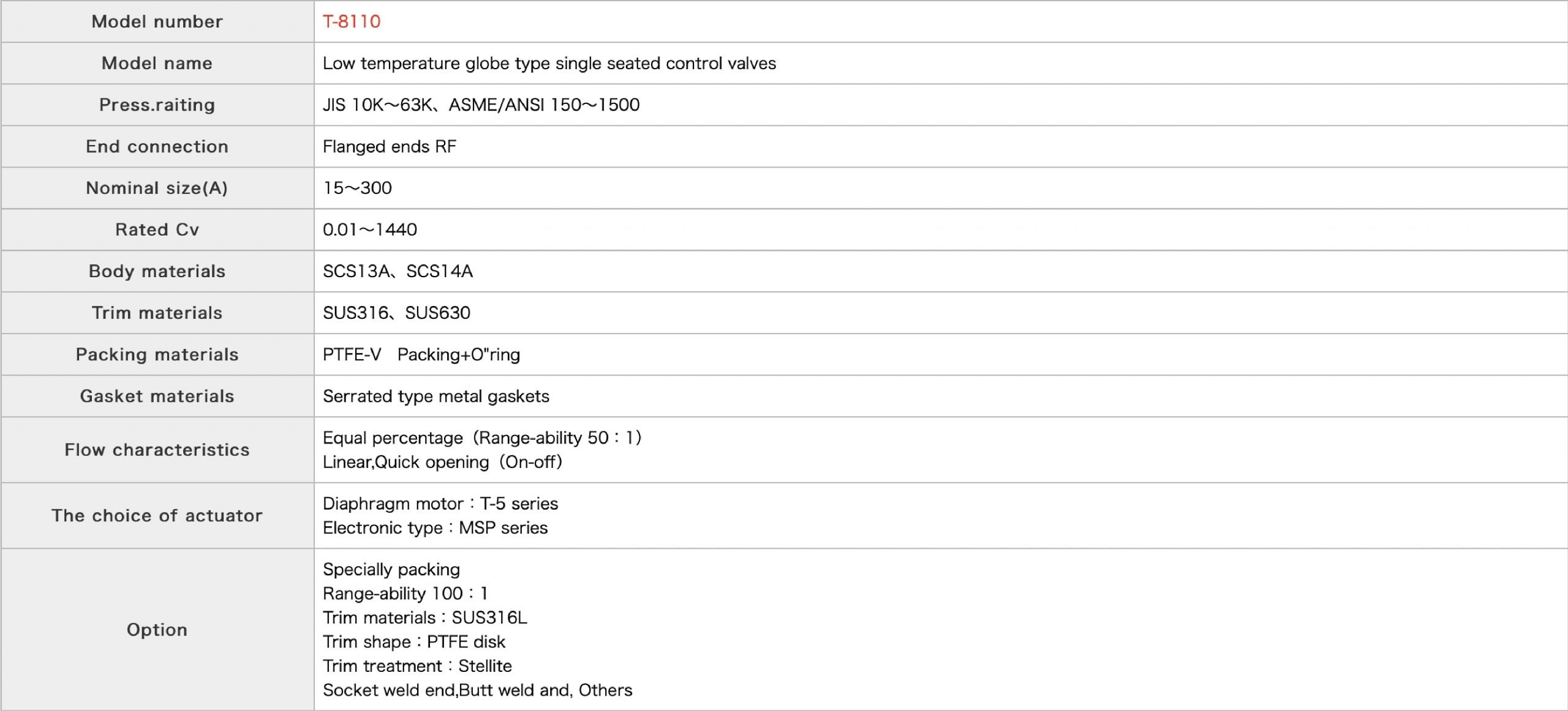 This control valve is a control valve which controls ultra-low temperature fluid, such as liquid helium whose service temperature is close to the absolute zero degree. There are two kinds of extension length. One is for 0℃ to -50℃, and the other is for -51℃ to -196℃.