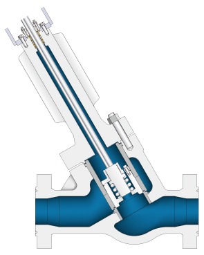 Control valve where a Y-shape body with less liqid stagnation and a pilot cage trim are combined.